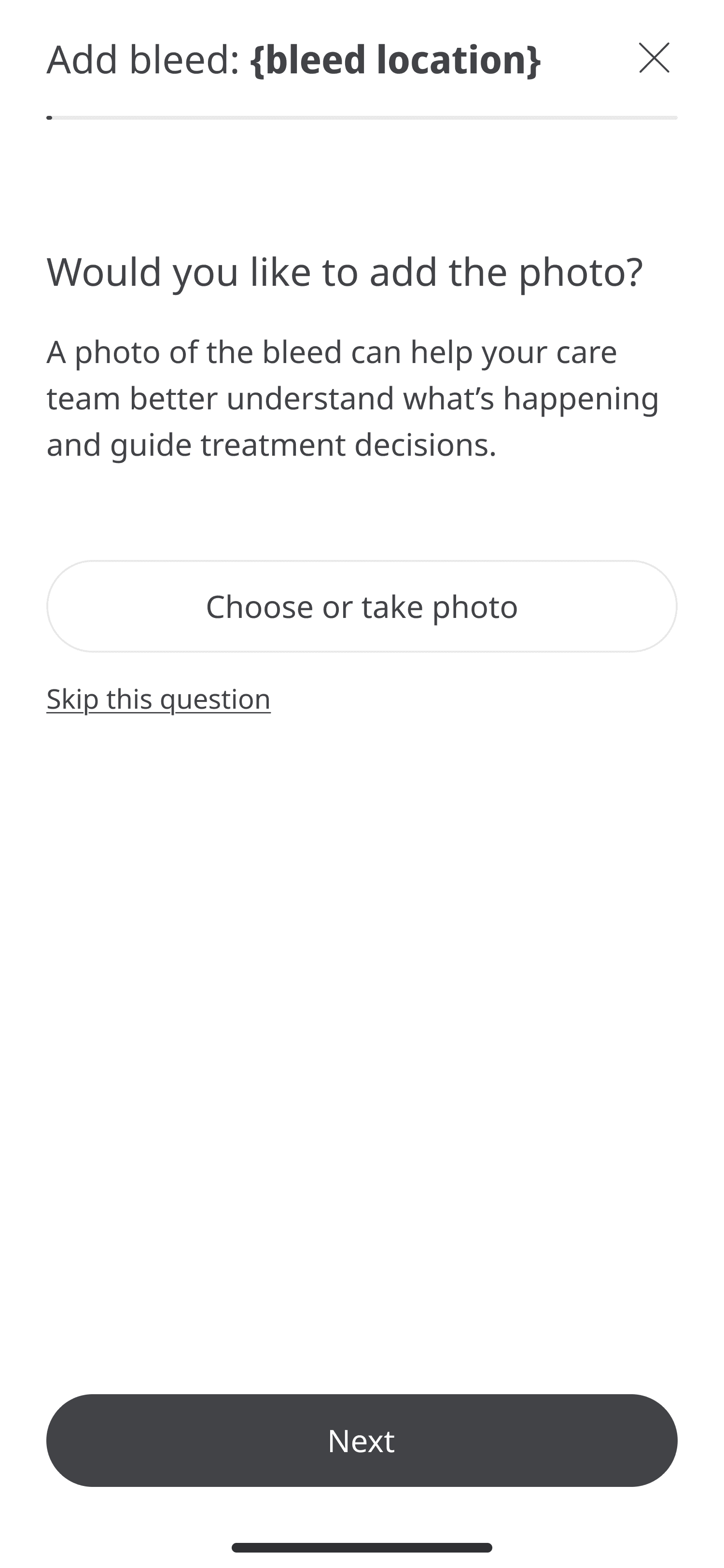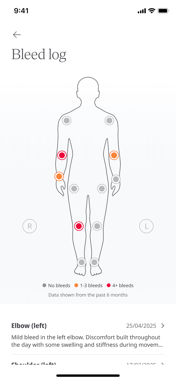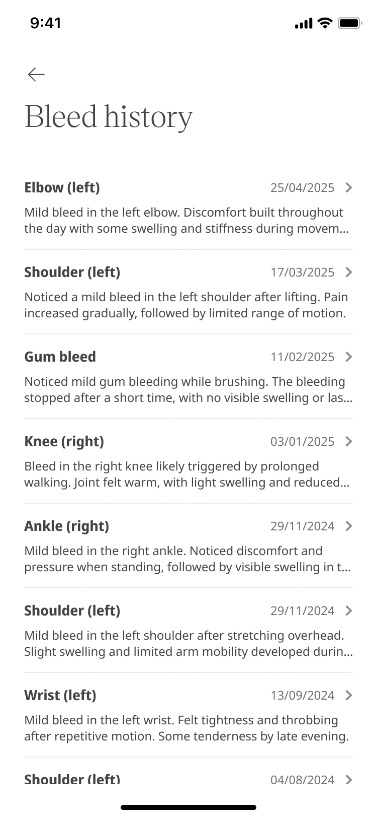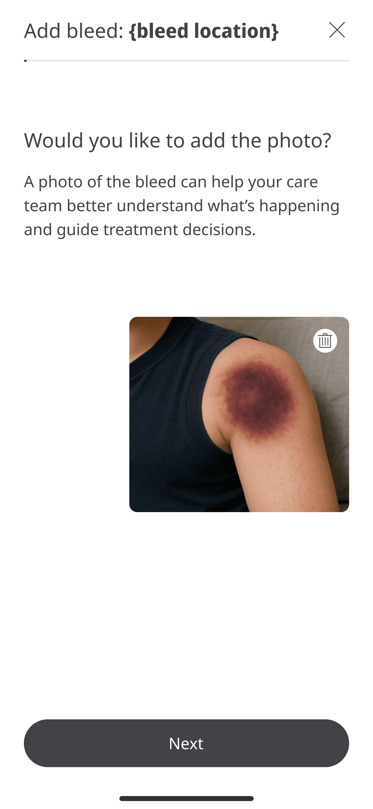 Evidence based reporting: I integrated a Photo and Detail flow where patients can upload images of their bleeds, transforming a subjective pain scale into objective clinical evidence for the care team.