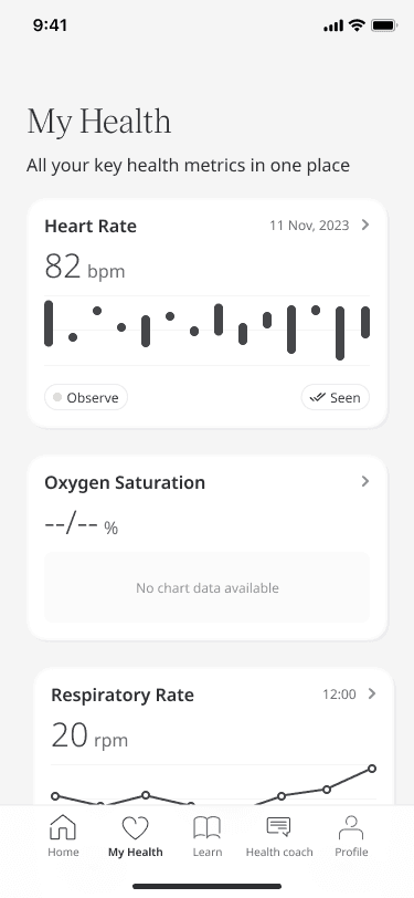 Modular health dashboard: I designed the My Health screen as a flexible container where specific metrics can be remotely toggled by the clinician based on the patient treatment plan.